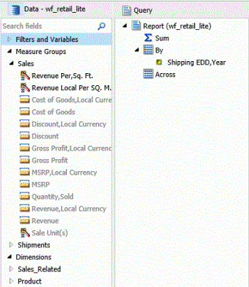 With Enforce Paths enabled, as shown in the following image, once the Shipping Date field is added to the field container, the sales related measures become unavailable so that the invalid request cannot be built.