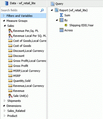 The data fields that display in the Data pane may vary. Depending on the underlying structure of your metadata, these fields may be organized and presented differently. For example, you may have just measures and dimensions, or you may have fields that represent multiple drill levels. You can also have any combination of these field types.