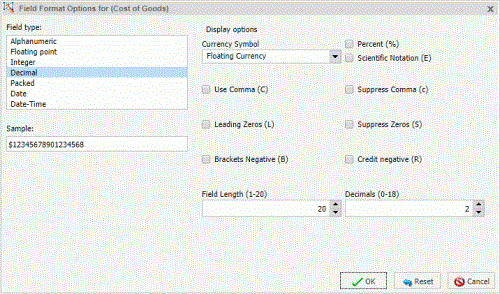 If the selected field matches the selected format type, its current length appears in the Field Length field. Otherwise, the default length appears in the Field Length field. The Decimals field shows the numbers of decimal places for Floating Point, Decimal, and Packed.