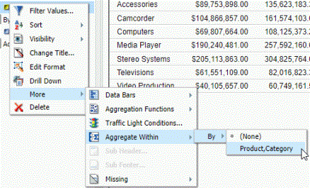 - Aggregation. Displays numeric measure data or non-numeric dimension data using aggregation options other than the default of Sum for measures or Count for non-numeric measures. For more information, see Display Numeric Measure Data Using Aggregation Options in a Report or Display Aggregations on Dimension (Non-Numeric) Data.
