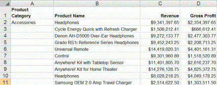 The Show Data with Related Columns functionality allows you to review more specific underlying data based on the fields that you have selected. Specifically, it displays data related to other fields that are part of the dimension hierarchy that you select. For example, if you selected the Product,Category dimension field, the related column data would include data from the Product,Subcategory and Model dimension fields, because these data fields are part of that dimension hierarchy.