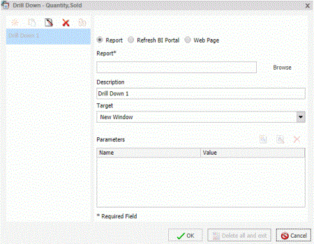 You create multiple drilldowns using the Drill Down dialog box, which you can access from the Links group on the Field tab. In the Query pane, click a measure to enable the Field tab. In the Links group, click Drill Down. The Drill Down dialog box displays, as shown in the following image.