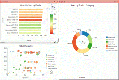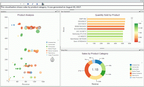 A visualization is comprised of one or more visuals, such as charts, maps, or grids and text. You can create different views of your data in a single visualization, and share that visualization with others in your enterprise.
