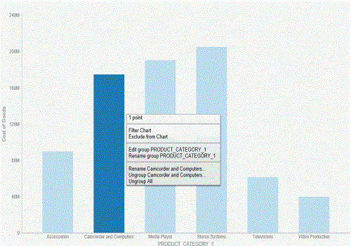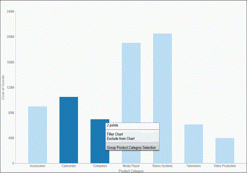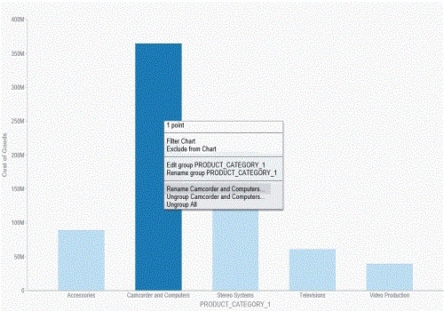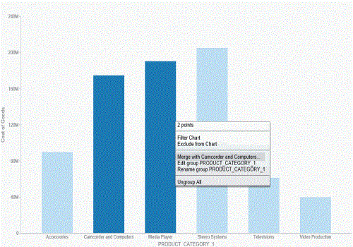 Once you group the values, they display in a unique group on the relevant axis. The group label is based on the original values stored for those components. For example, in the previous image, we grouped Camcorder and Computers in the PRODUCT_CATEGORY_1 group, as shown in the following image.