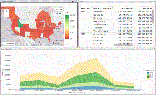 The following image shows a sample visualization. This visualization includes a map, a matrix grid, and a stacked area chart.