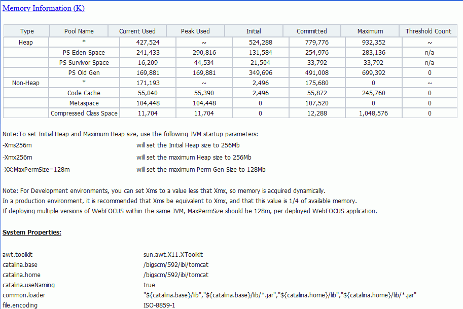 To view your current Java VM memory settings, access the WebFOCUS Administration Console. In the left pane of the console, select the Diagnostics tab and then select JVM Property Info.