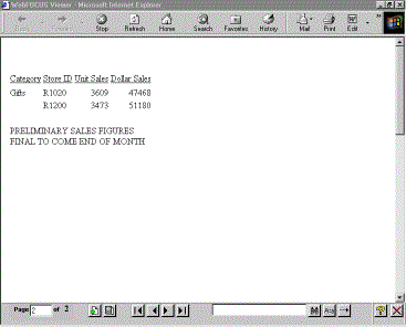 TABLE FILE GGSALES SUM DOLLARS BY CATEGORY SUBHEAD "<CATEGORY ALERT: SALES FALL BELOW $17,000,000" WHEN DOLLARS LT 17000000; ON TABLE SET PAGE-NUM OFF ON TABLE SET ONLINE-FMT HTML ON TABLE SET STYLESHEET * TYPE=REPORT, GRID=OFF, $ ENDSTYLE END