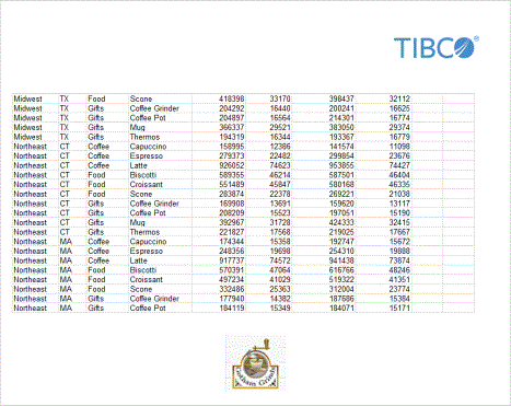 TABLE FILE GGSALES HEADING "Report 1: Coffee - Budget" SUM BUDDOLLARS BUDUNITS COLUMN-TOTAL AS 'Total' BY REGION IF CATEGORY EQ Coffee ON TABLE PCHOLD FORMAT XLSX OPEN NOBREAK ON TABLE SET STYLE * TYPE=REPORT, TITLETEXT=Coffee, FONT=ARIAL, SIZE=10, STYLE=NORMAL,$ TYPE=TITLE, STYLE=BOLD,$ TYPE=HEADING, SIZE=12, STYLE=BOLD, COLOR=BLUE,$ TYPE=GRANDTOTAL, STYLE=BOLD,$ END