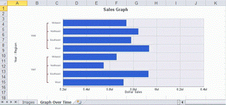 When you run the sample procedure, a pivotwithchart.xlsx workbook is generated, with the WebFOCUS report data stored in the second worksheet.