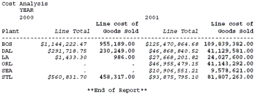 TABLE FILE CENTORD SUM QUANTITY LINEPRICE LINE_COGS AS 'Line Cost of, Goods Sold' BY PLANT BY ORDER_NUM BY PRODNAME ON PLANT SUBTOTAL ON ORDER_NUM SUBTOTAL WHERE ORDER_NUM EQ '35774' OR '48041' WHERE PLANT EQ 'BOS' ON TABLE SET PAGE-NUM OFF ON TABLE SET STYLE * TYPE=REPORT, GRID=OFF,$ TYPE=SUBTOTAL, BY=PLANT, COLUMN=LINE_COGS, STYLE=BOLD+ITALIC, COLOR=BLUE,$ TYPE=SUBTOTAL, BY=ORDER_NUM, COLUMN=QUANTITY, STYLE=BOLD, SIZE=11,$ ENDSTYLE END