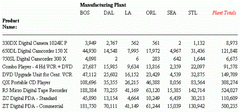 TABLE FILE CENTORD SUM QUANTITY BY PRODNAME ACROSS PLANT AS 'Manufacturing Plant' ACROSS-TOTAL AS 'Plant Totals' WHERE PRODTYPE EQ 'Digital' ON TABLE SET PAGE-NUM OFF ON TABLE SET STYLE * TYPE=REPORT, GRID=OFF, $ TYPE=ACROSSVALUE, COLUMN=N8, STYLE=ITALIC, COLOR='RED', $ ENDSTYLE END
