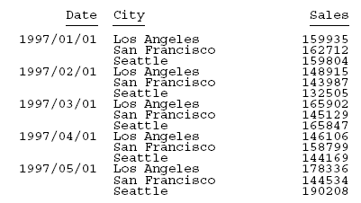 The following request against the GGSALES data source sums dollar sales by city and by date: