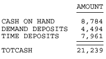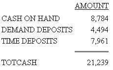 TABLE FILE LEDGER SUM AMOUNT FOR ACCOUNT 1010 AS 'CASH ON HAND' OVER 1020 AS 'DEMAND DEPOSITS' OVER 1030 AS 'TIME DEPOSITS' OVER BAR AS '=' OVER RECAP TOTCASH = R1 + R2 + R3; ON TABLE SET ONLINE-FMT PDF ON TABLE SET PAGE-NUM OFF ON TABLE SET STYLE * TYPE=REPORT, GRID=OFF, $ ENDSTYLE END
