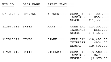 DEFINE FILE EMPLOYEE INCREASE/D8.2M = .05*CURR_SAL; CURR_SAL/D8.2M=CURR_SAL; NEWSAL/D8.2M=CURR_SAL + INCREASE; END TABLE FILE EMPLOYEE PRINT CURR_SAL OVER INCREASE OVER NEWSAL BY LOWEST 4 EMP_ID BY LAST_NAME BY FIRST_NAME ON EMP_ID SKIP-LINE ON TABLE SET PAGE-NUM OFF ON TABLE SET ONLINE-FMT PDF END