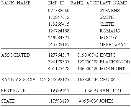 TABLE FILE EMPLOYEE PRINT EMP_ID AND BANK_ACCT AND LAST_NAME BY BANK_NAME ON BANK_NAME UNDER-LINE ON TABLE SET PAGE-NUM OFF ON TABLE SET STYLE * TYPE=REPORT, GRID=OFF, $ ENDSTYLE END