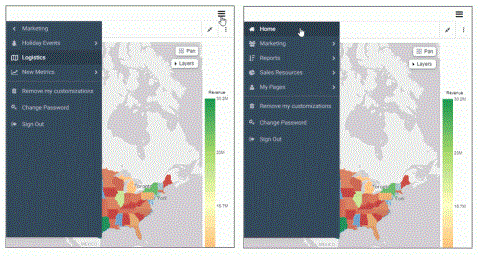 Note: Depending on the type of your navigation layout, certain levels do not display icons. The second level of the two-level side navigation layout does not display icons. The third level of the three-level navigation layout does not display icons. All layouts display icons for the top level of navigation. Responsive menus on mobile devices display icons for all levels of navigation.