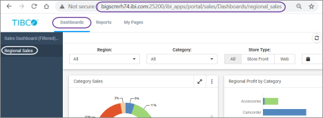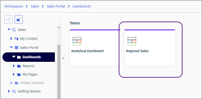 In our example, we locate the Regional Sales page inside the Dashboards folder, as shown in the following image.