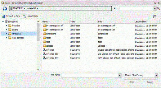 The Open dialog box displays when you launch WebFOCUS InfoAssist. It also displays when you join and blend data. You can use this dialog box to do the following:
