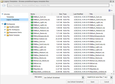 The theme that you select determines the coloring and hues that display within WebFOCUS InfoAssist. The default templates in the Templates section apply to all languages, whereas some of those in the Legacy Templates sections are specific to just one language (for example, EN=English).