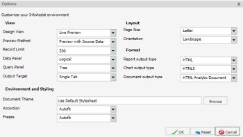 Note: If you make changes to the default selections in the Options dialog box, changes will take effect the next time WebFOCUS InfoAssist launches.