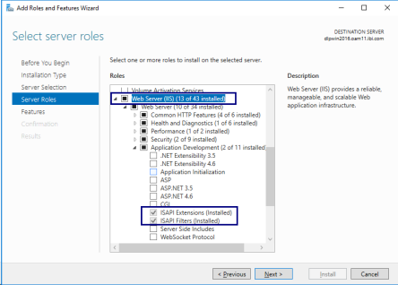 - On the Select server roles dialog, ensure that the following components are installed: