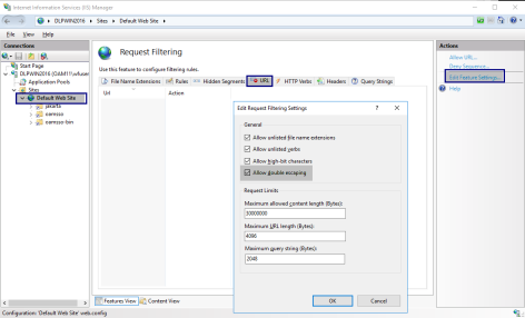 - From the Section dropdown list, select System.web/httpRuntime for requestPathInvalidcharacters under Deep Path, add a space as the value, and Save.