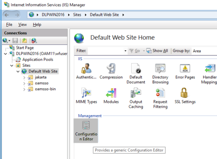 - To remove this restriction, perform the following steps. For your default web site, click Configuration Editor, as shown in the following image.