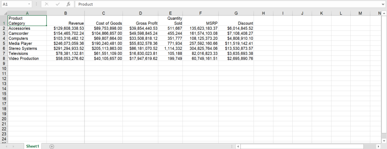 The WebFOCUS procedure generates a new workbook containing a single worksheet with the report output containing your defined report elements (headings and subtotals), as well as StyleSheet syntax (such as conditional styling and drill downs):