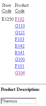 When you execute the report procedure, the following report displays in the web browser. If you select a Product Code link, the JavaScript function ShowItem executes, and displays the value of the PRODUCT_DESCRIPTION field (a NOPRINT field) in the text box in the form below the report. For example, if you select the Product Code G104, "Thermos" displays in the Product Description field.