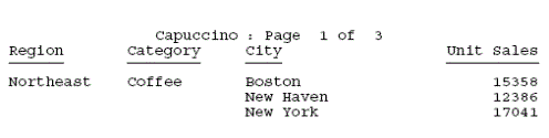 The following request against the GGSALES data source sorts by product, region, category, and city. It resets the pagination each time the product changes. The heading prints the current page number and the total within each product group.