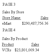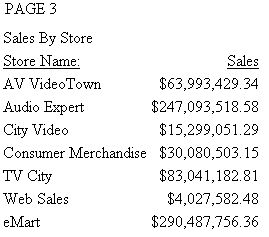 SET FOCFIRSTPAGE = 3 TABLE FILE CENTORD HEADING "Sales By Store" SUM LINEPRICE AS 'Sales' BY SNAME ON TABLE SET STYLE * TYPE=REPORT, GRID=OFF, $ ENDSTYLE END