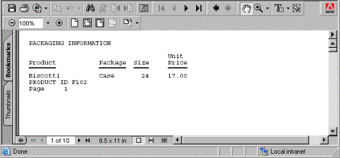 SET PAGE-NUM = NOPAGE TABLE FILE GGPRODS ON TABLE SUBHEAD "PACKAGING INFORMATION" " " PRINT PACKAGE_TYPE AND SIZE AND UNIT_PRICE BY PRODUCT_DESCRIPTION ON PRODUCT_DESCRIPTION PAGE-BREAK SUBFOOT "PRODUCT ID <PRODUCT_ID" "Page <TABPAGENO " ON TABLE SET ONLINE-FMT PDF END