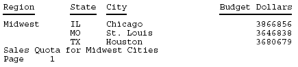 TABLE FILE GGSALES SUM BUDDOLLARS BY REGION BY ST BY CITY ON REGION PAGE-BREAK SUBFOOT "Sales Quota for <REGION Cities" "Page <TABPAGENO" ON TABLE SET ONLINE-FMT PDF END