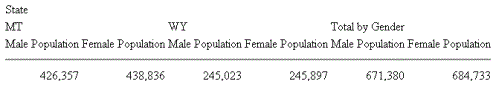 TABLE FILE GGDEMOG SUM MALEPOP98/D12 FEMPOP98/D12 ROW-TOTAL AS 'Total by Gender' ACROSS ST WHERE ST EQ 'WY' OR 'MT'; ON TABLE SET PAGE-NUM OFF ON TABLE SET ONLINE-FMT HTML ON TABLE SET STYLESHEET * TYPE=REPORT, GRID=OFF, $ ENDSTYLE END