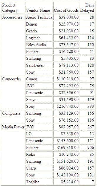 JOIN ID_VENDOR IN WF_RETAIL_MULTI_PARENT TO ID_VENDOR IN WF_RETAIL_VENDOR AS J1 TABLE FILE WF_RETAIL_MULTI_PARENT SUM COGS_US DAYSDELAYED BY PRODUCT_CATEGORY BY VENDOR_NAME WHERE PRODUCT_CATEGORY LT 'S' ON TABLE SET PAGE NOPAGE END