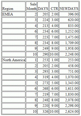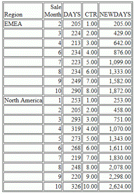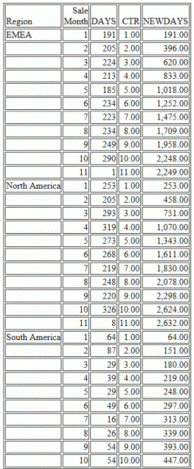 The output is shown in the following image. The COMPUTE calculation for NEWDAYS was processed after eliminating the rows in which TOTAL DAYSDELAYED were 200 or less, so its values are based on fewer rows than the calculations in the original request. This is verified by the CTR values, which are now in a continuous sequence. The rolling total now reflects the values that are actually displayed on the report output.