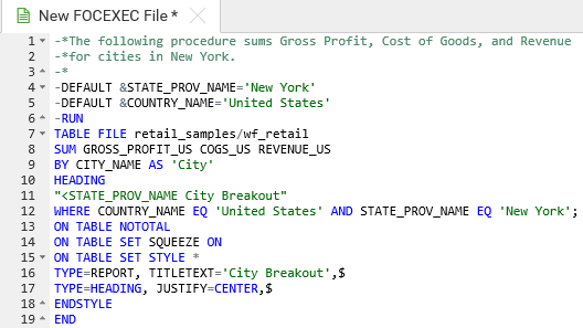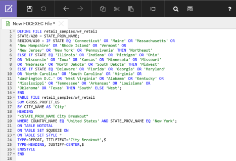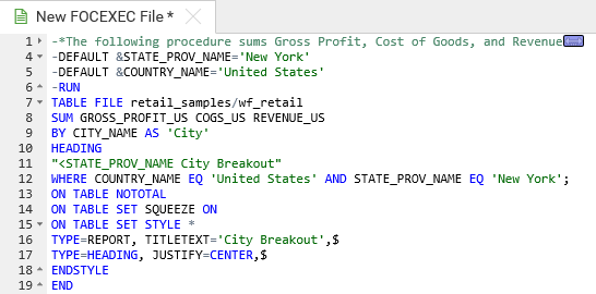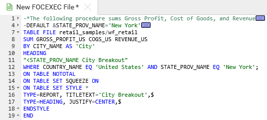 The following image displays a WebFOCUS procedure, with line numbers in the sidebar, for each line of code.