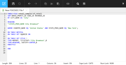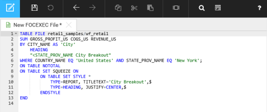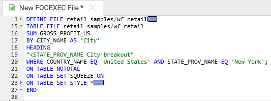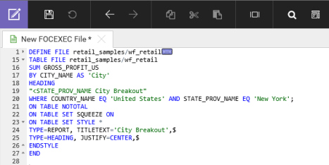 To collapse the TABLE request, click the code-folding toggle icon on the TABLE FILE command line (line 15). Note that lines 15 through 27 are collapsed, as shown in the following image.
