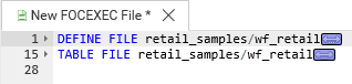 To collapse the DEFINE statement, click the code-folding toggle icon on the DEFINE FILE command line (line 1). Note that lines 1 through 14 are collapsed, as shown in the following image.