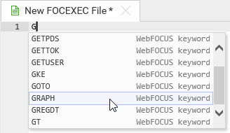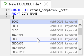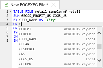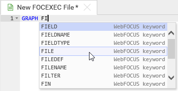 - Autocomplete. Allows progressive addition and suggestion of code as you type. Autocomplete is available for FOCEXEC, HTML, JavaScript, CSS, and Python files. Autocomplete is not supported for SQL, R, STY, and TXT files. The default value is on.