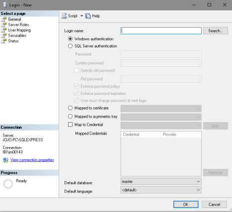 It is a good idea to set this database as the default for your user ID. To do this, under Security and Logins, right-click your user ID and choose Properties. Then set the Default database and click OK.