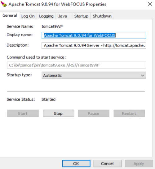 You can access the Apache Tomcat Properties window by selecting Programs, Information Builders, Tomcat, and then Tomcat Configuration Utility. The following image shows the Apache Tomcat 9.0.94 for WebFOCUS Properties window.