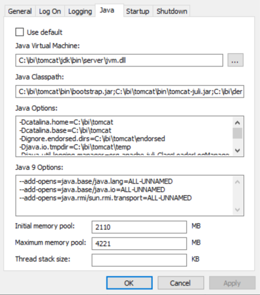 Open the Tomcat Configuration Utility and select the Java tab, as shown in the following image.