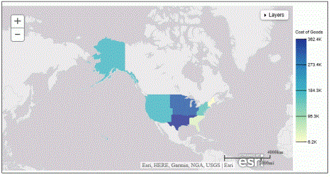 More specifically, maps use non-intrusive GIS workflows with existing data. You can view symbol layers for data-bound to a geo-location, such as state, country, and ZIP code, in an integrated map viewer. Using metrics from your data, you can also visualize geographic roles or dimensions. Geographic roles, or dimensions, can be built directly into your Metadata or assigned to a data field when you create a map.