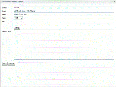Enter a name for the basemap, a URL to the thumbnail, a title to display, and the URL to the map service that provides the basemap, and click Verify.
