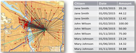 Maps also allow you to measure size, shape, and distribution to detect and quantify patterns, and even perform predictive analytics. An example of how maps can help detect and quantify patterns is the scenario in which a state agency used a mapping application to solve a problem with their food stamp system. Using this application, odd food stamp redemptions, such as rounded numbers transactions, were discovered. By plotting those transactions on a map, the agency discovered that the redemptions appeared in the same geographic location. On further investigation, the agency identified that individuals were selling their food stamps at reduced prices, $50 worth of food stamps for $40 in cash, to others instead using them as intended. This map example is shown in the following image.