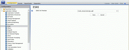 This field identifies the path to the internal ArcGIS Javascript API Source that develops ESRI-based maps. This setting is blank, by default, indicating that the use of the internal API source to develop ESRI maps is not activated. The API that is referenced is https://js.arcgis.com/3.28/, by default. To direct WebFOCUS Designer to use the internal ArcGIS Javascript API to develop ESRI maps, enter the path to the local API files that you extracted into this setting. For more information, see the WebFOCUS Security and Administration manual.