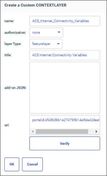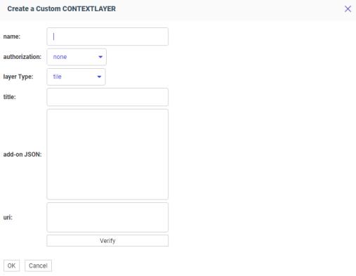 Enter a name for the context layer, the authorization type, a layer type, a title to display, any additional JSON needed for rendering the context layer, and the URI to the map service that provides the context layer, and click Verify.