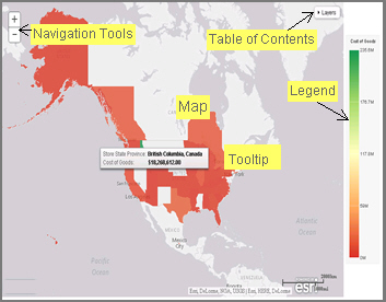Using WebFOCUS Designer with the Esri integration, you can create maps that help you illustrate or identify trends so you can take action quickly. WebFOCUS architecture provides the framework in which this system operates. Using a JavaScript map viewer, you can navigate the interface easily, as shown in the following image.