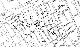 An early example of how maps can be used to illustrate trends is the case of Dr. John Snow, an epidemiologist who was one of the first to use data to map occurrences of cholera to find the cause of infection. By plotting the cholera data on a map of a town, Dr. Snow was able to visualize a trend that showed higher incidences of cholera closest to water pumps. This example is shown in the following image.